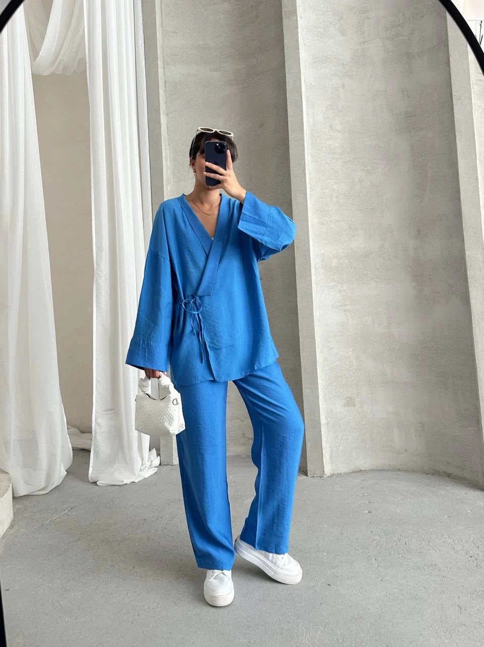 طقم بنطلون مع قميص ازرق